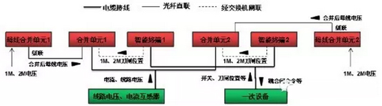 合并單元1→線路測控傳遞:測量電流、電壓、合并單元1告警信號(hào);