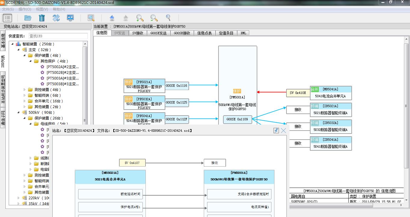 上圖為山東容弗的SCD可視化工具,目前,業(yè)界普遍采用此類工具對(duì)智能變電站信息流進(jìn)行查看及檢視。此種工具一般以圖形化的方式展示智能設(shè)備間的互操作關(guān)系,并且輔以差異化比較、配置文件規(guī)范性檢測等功能,對(duì)智能站的調(diào)試、檢修、消缺均有一定幫助。