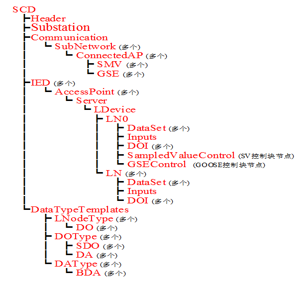 下面簡要描述一下Communication、IED和DataTypeTemplates三部分中過程層比較關(guān)心的內(nèi)容。
