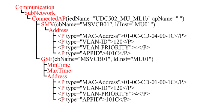 Communication部分描述各個IED的SV控制塊和GOOSE控制塊的地址信息。SMV節(jié)點(diǎn)下Address節(jié)點(diǎn)配置了SV控制塊的APPID、MAC、VLAN-ID和VLAN優(yōu)先級,GOOSE控制塊的相關(guān)參數(shù)是在GSE節(jié)點(diǎn)下的Address節(jié)點(diǎn)中配置,此外,GSE節(jié)點(diǎn)中還配置了GOOSE報文發(fā)送的心跳時間MaxTime和最小重發(fā)時間MinTime。