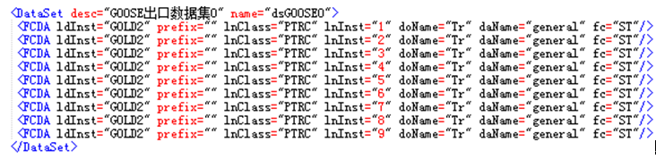 數(shù)據(jù)集DataSet的結(jié)構(gòu)如下圖。name屬性是其標(biāo)識,上面提到的SV/GOOSE控制塊的屬性datSet指定的就是DataSet的name,通過比對這兩個字符串,可以找到SV/GOOSE控制塊所關(guān)聯(lián)的數(shù)據(jù)集。desc屬性給出了數(shù)據(jù)集的描述信息。DataSet節(jié)點(diǎn)由多個子節(jié)點(diǎn)FCDA組成,比較FCDA和上面的ExtRef我們可以看到他們有一些相似的屬性(ldInst、prefix、lnClass等),不同的是ExtRef中的這些屬性指定的是外部某IED的數(shù)據(jù)路徑,而FCDA的這些屬性指定的是本IED的數(shù)據(jù)路徑。