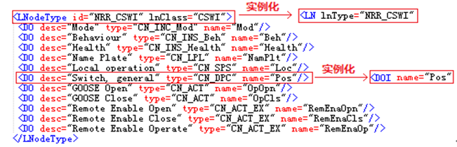 上圖是一個邏輯節(jié)點(diǎn)類型的例子,每個IED中的LN0/LN節(jié)點(diǎn)都是某個LNodeType的實(shí)例,通過比對前者的lnType屬性和LNodeType的id屬性,可以確定每個LN0/LN都是由那個LNodeType實(shí)例化的。LN0/LN節(jié)點(diǎn)下的DOI是相應(yīng)LNodeType下具有相同name的DO的實(shí)例化對象。