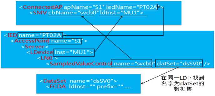 在SCD文件中一個SV/GOOSE報文的完整配置包括三個部分:控制塊參數(shù)(SampledValueControl/GSEControl)、通信參數(shù)(SMV/GSE)、數(shù)據(jù)集配置(DataSet)。各部分的具體內(nèi)容在上一節(jié)已經(jīng)描述,下圖顯示了三個部分之間的關(guān)聯(lián):通過比對IED的name、訪問點(diǎn)的name、LD的實(shí)例名inst和控制塊的name 找到與控制塊匹配的SMV/GSE;通過比對控制塊的datSet屬性和數(shù)據(jù)集DataSet的name找到與控制塊匹配的DataSet。